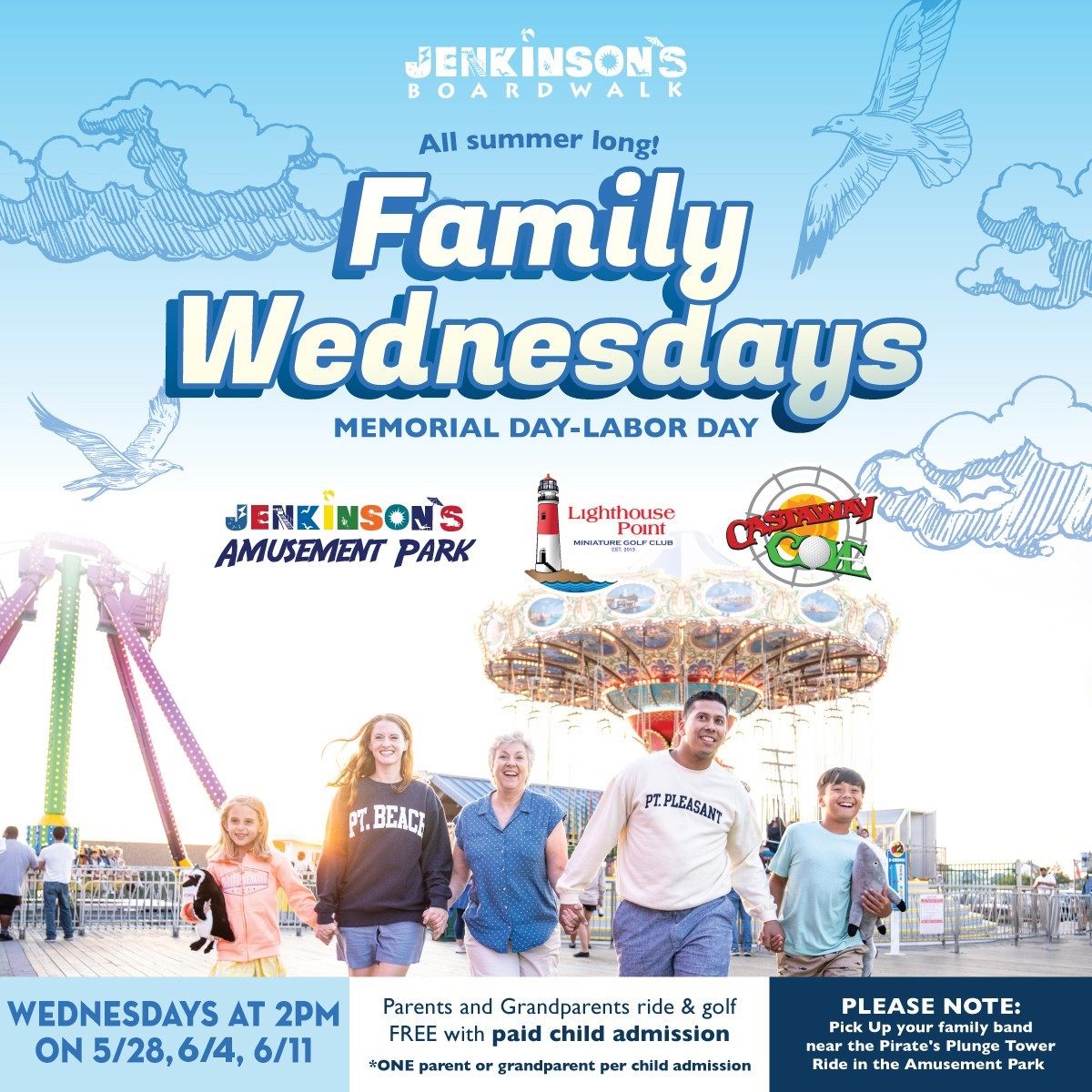 From Memorial Day through Labor Day, take advantage of our Family Wednesdays special: Parents and grandparents receive FREE rides and miniature golf admission with a paid child admission (ages apply). That’s free access to Jenkinson’s Amusement Park rides, Lighthouse Point Miniature Golf, and Castaway Cove for the adults!