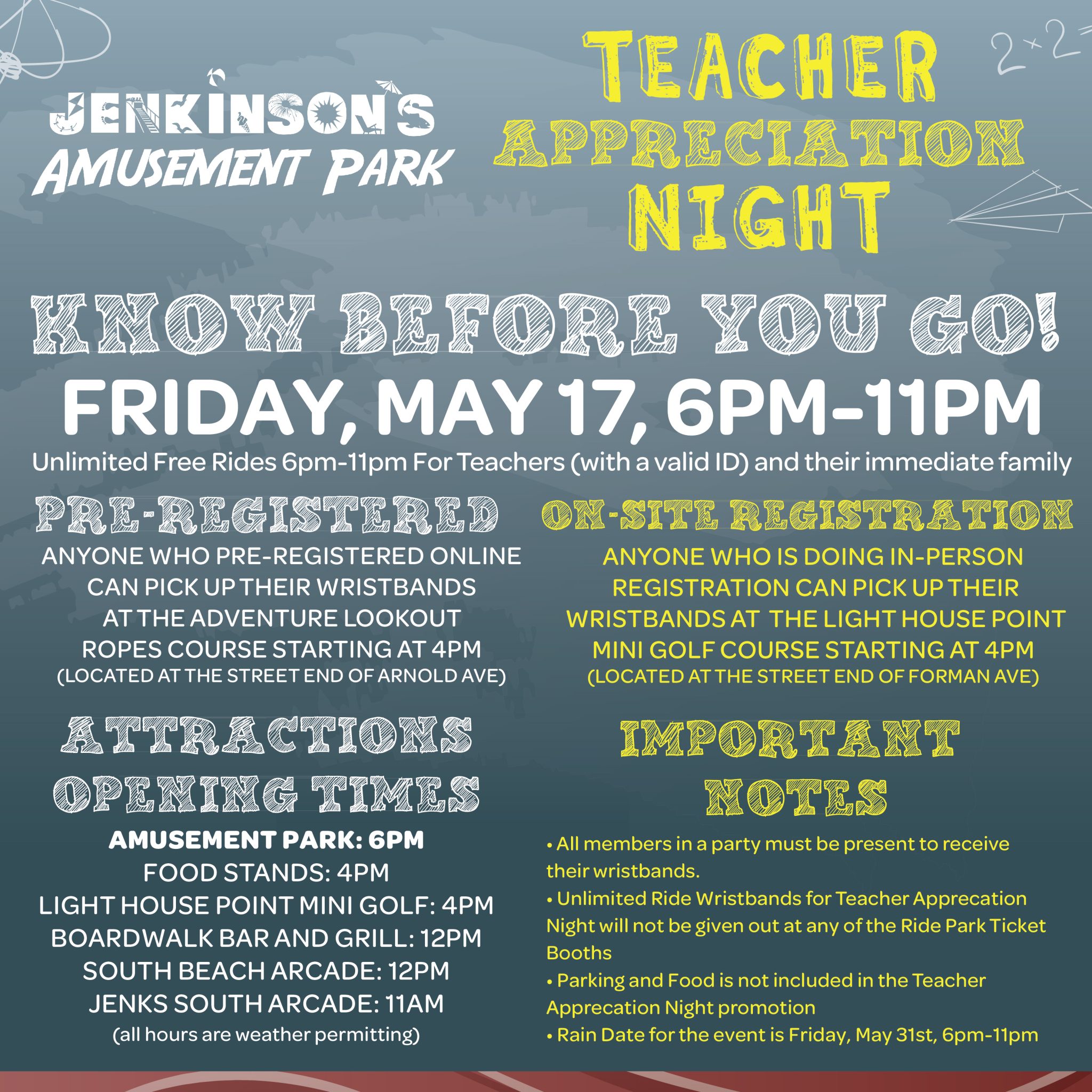 Jenkinson’s Boardwalk is honoring you with our annual Teacher Appreciation Night at the Jenkinson’s Amusement Park. On Friday, May 17th from 6pm-11pm, Teachers (with a valid ID) and their immediate family can enjoy unlimited free rides and ropes course admission!